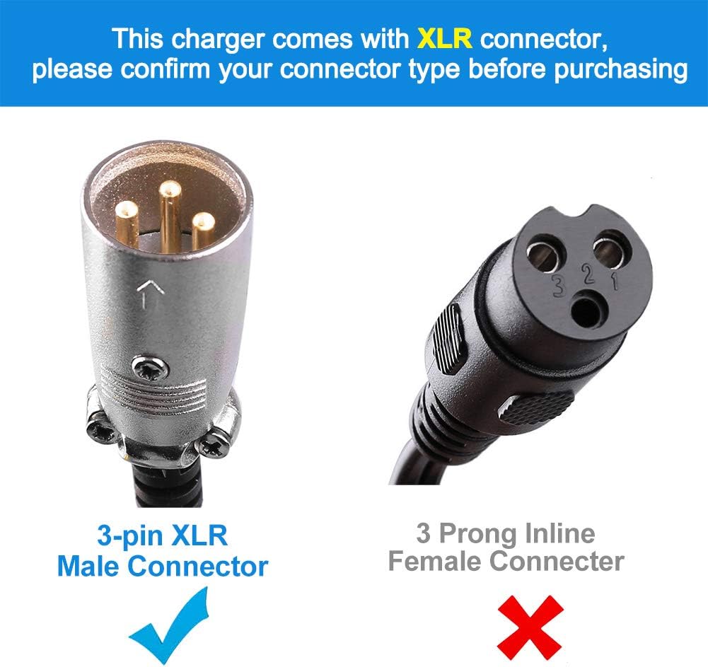 - CONNECTOR - 3-pin XLR male connector; this battery charger fits lead acid battery only