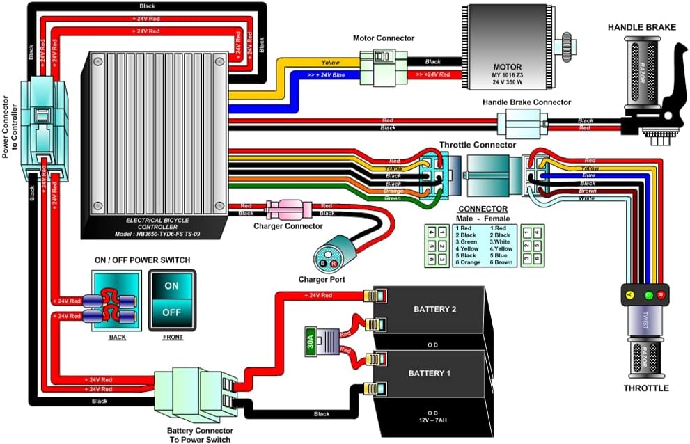- Replace Razor part #: W25143069015, Model No: HB2430-TYD6-FS-ROHS. 5 connectors, 6 pin throttle connector