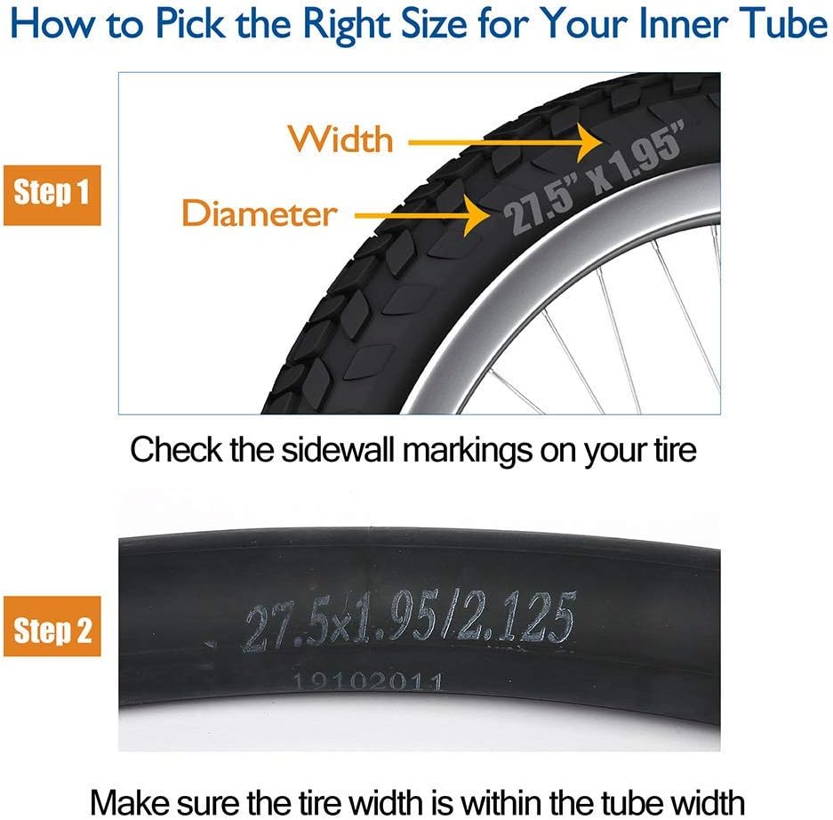 - 【Size】This 27.5” bike inner tube fits 27.5-inch bike tire, tire width between 1.95 to 2.125. (Please kindly confirm that your bike tire is 27.5inch before you buy)