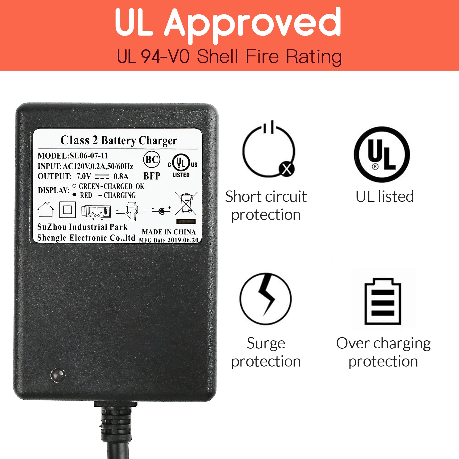 - INPUT: AC 120V 0.2A 50/60Hz; Output: 7.0V 0.8A; Connector: Square-Type Plug; Cable Length: 6FT; MODEL: SL06-07-11