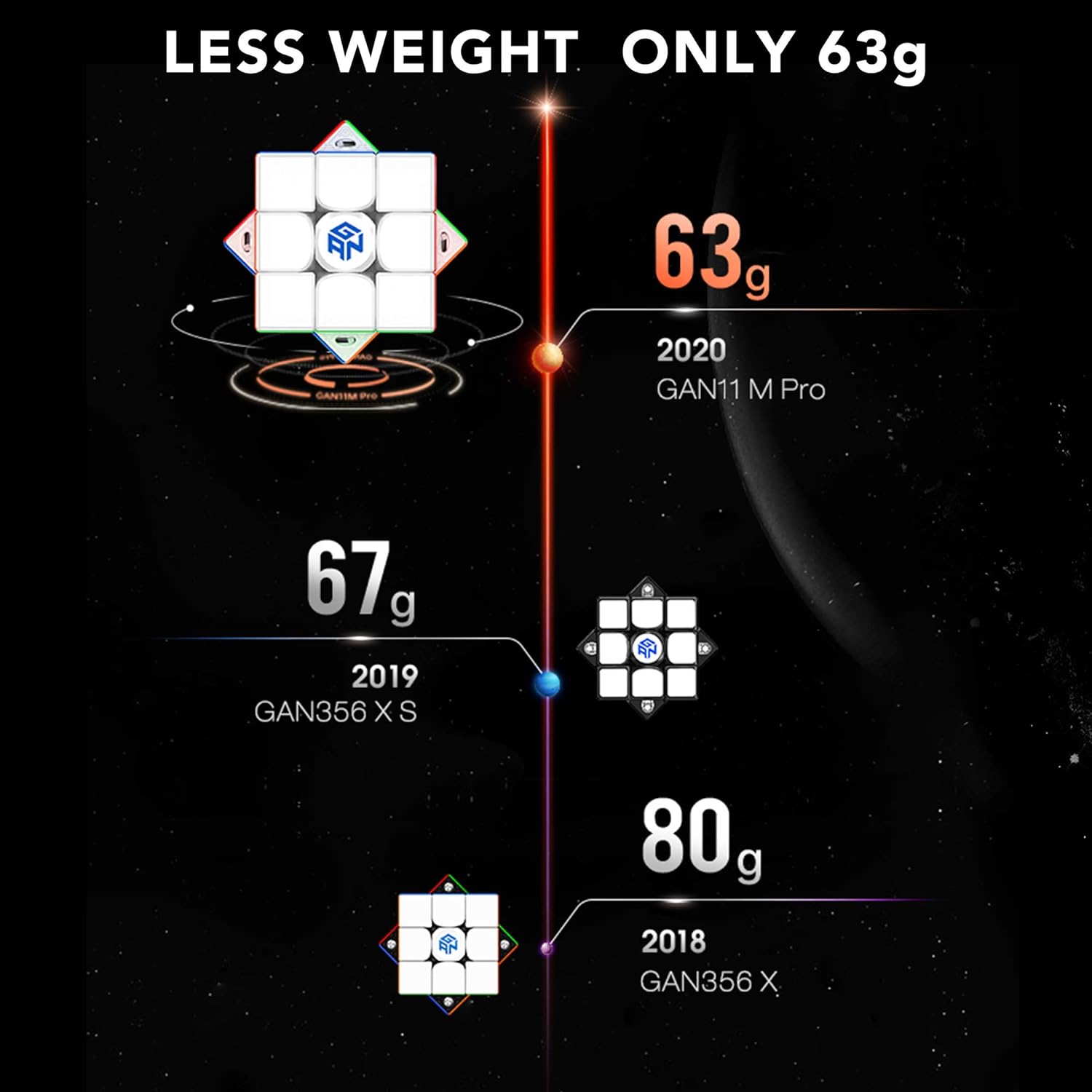 - Incredibly light 63 Grams: GAN11 M Pro weighs only 63 grams. Lightweight engineering made possible by GAN’s unwavering effort to continuously improve. Decreased weight while still providing enhanced control and smoothness. Once you try the GAN 11 M Pro, you’ll never want to go back to those heavy, clunky cubes.