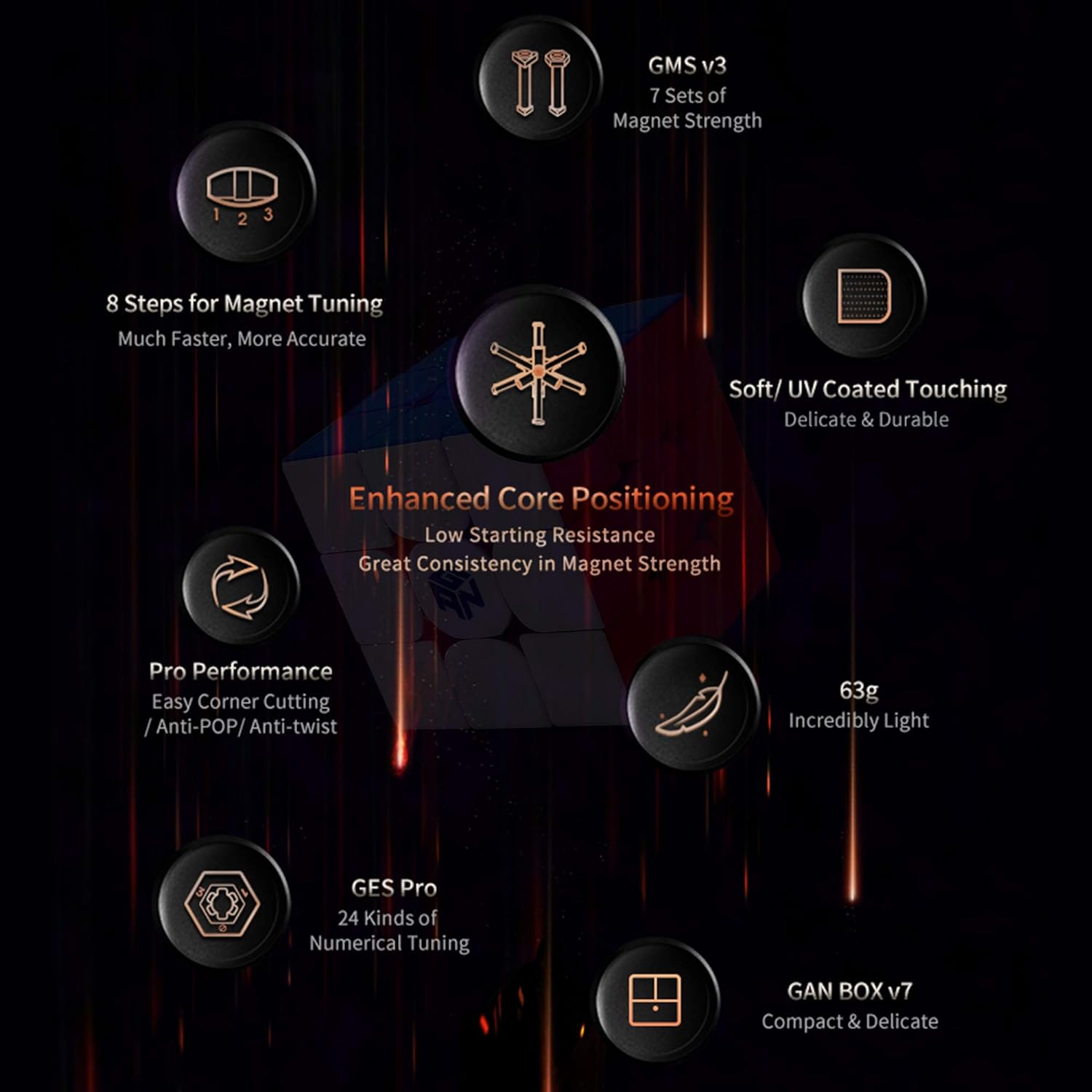 - Magnetic Design: In the GAN 11 M Pro Speed Cube, The GAN core has one set of magnets, and the corner pieces hold the other set. When the cube turns, the distance between the magnets is always within a calculated range, resulting in low tactility and better stability.